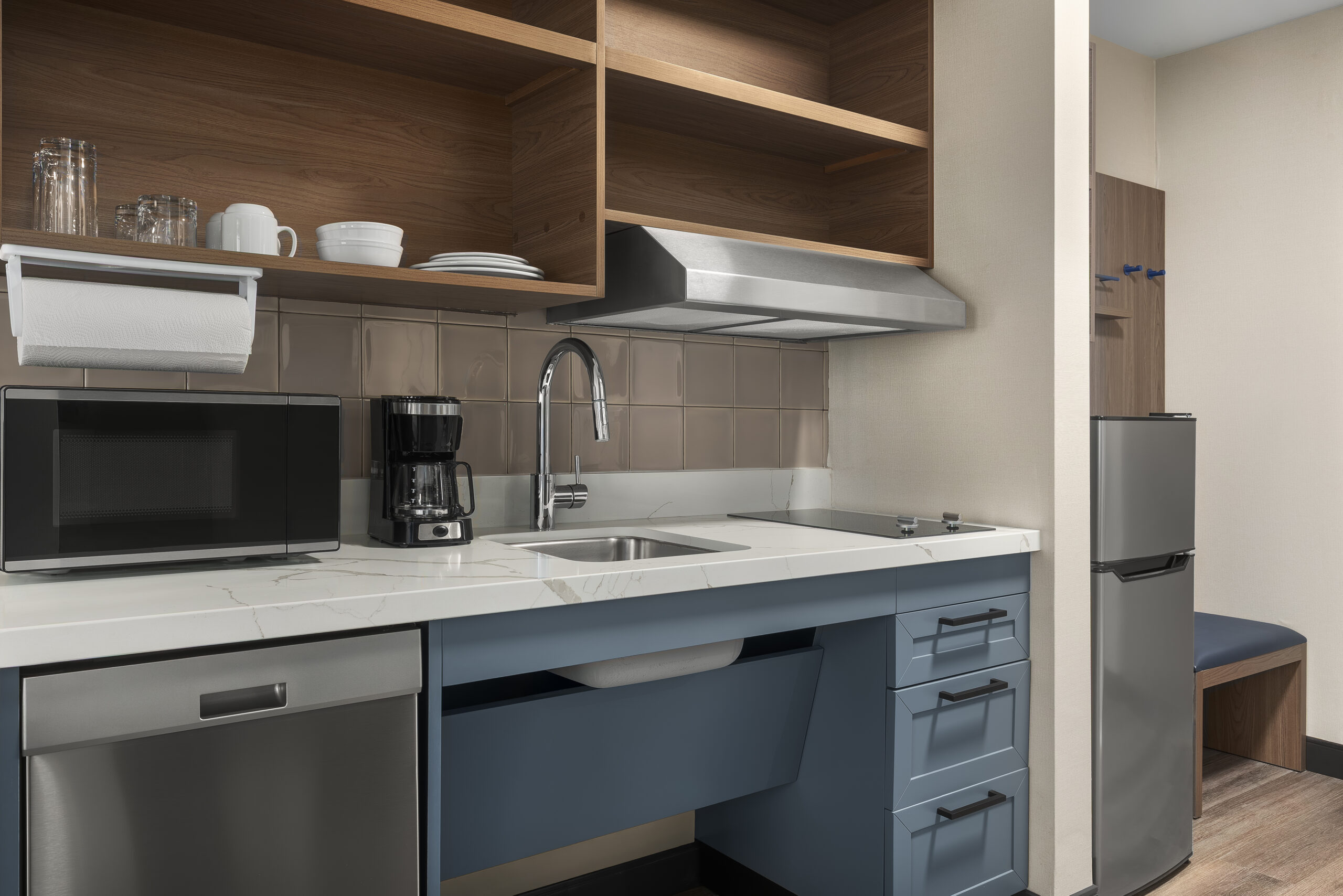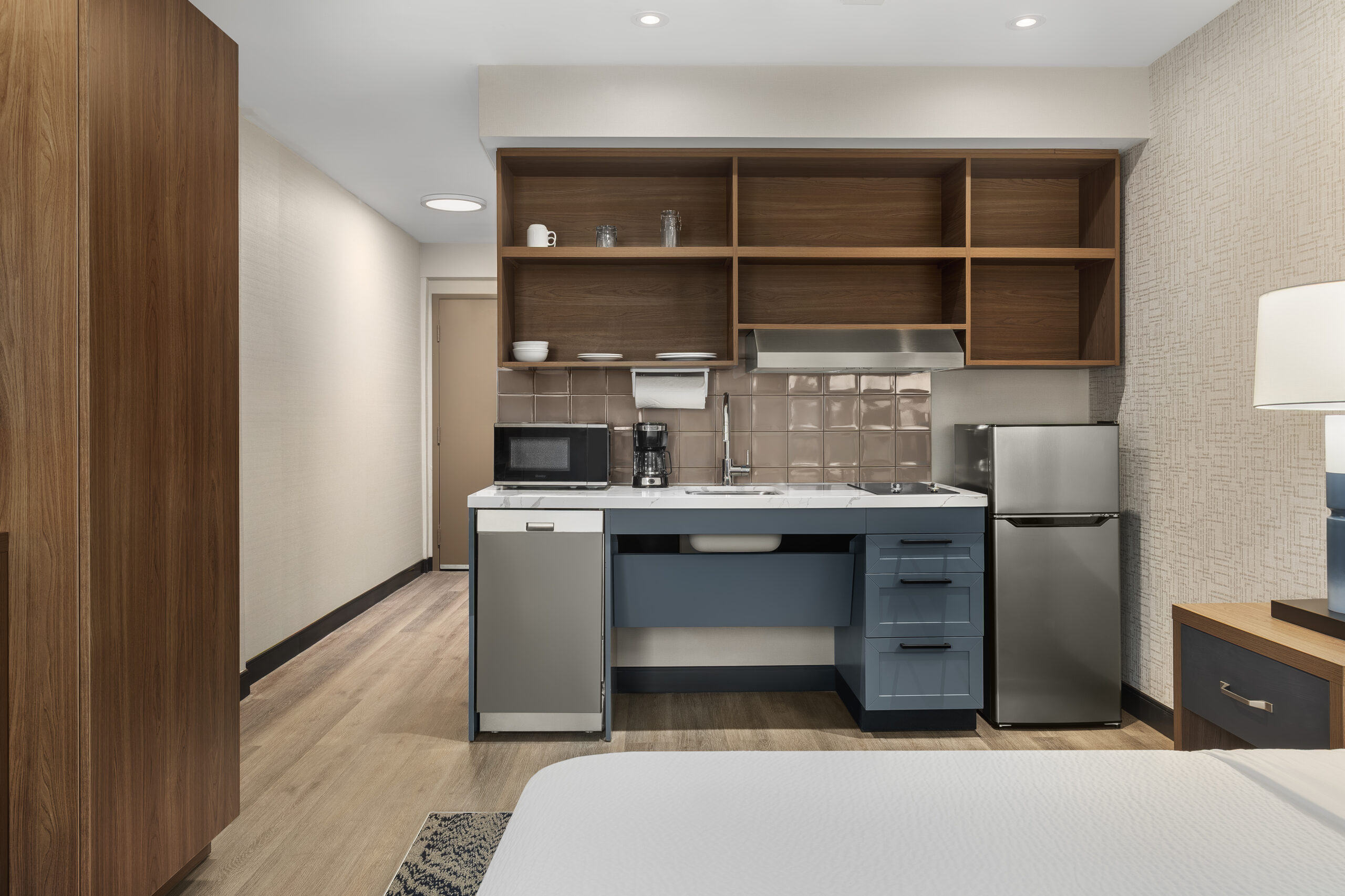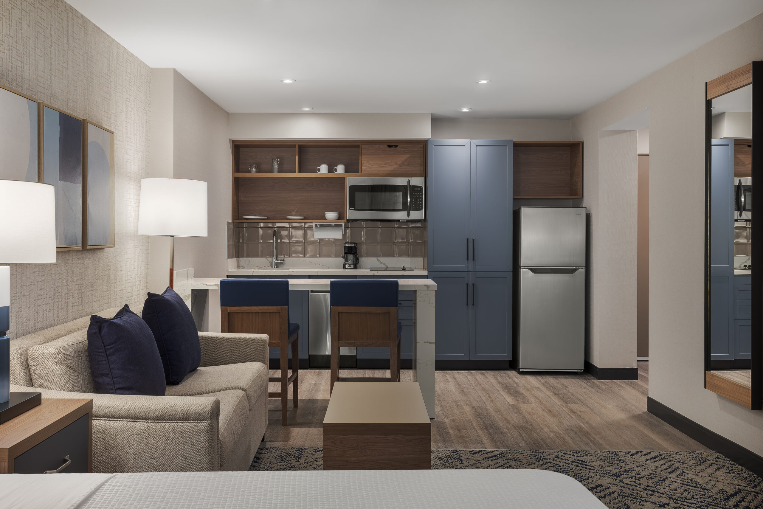 Each spacious suite offers a fully equipped kitchen with refrigerator, stovetop, microwave, dishwasher, cookware, and tableware. Need more? Borrow a blender, crockpot, or rice cooker from our Lending Locker to feel right at home. For snacks or drinks, stop by the 24/7 Candlewood Cupboard stocked with quick options. After a busy day, relax on your sofa or recliner while enjoying premium channels or the latest rentals. Guests looking to stay productive can use a dedicated workspace and complimentary high-speed WiFi.
